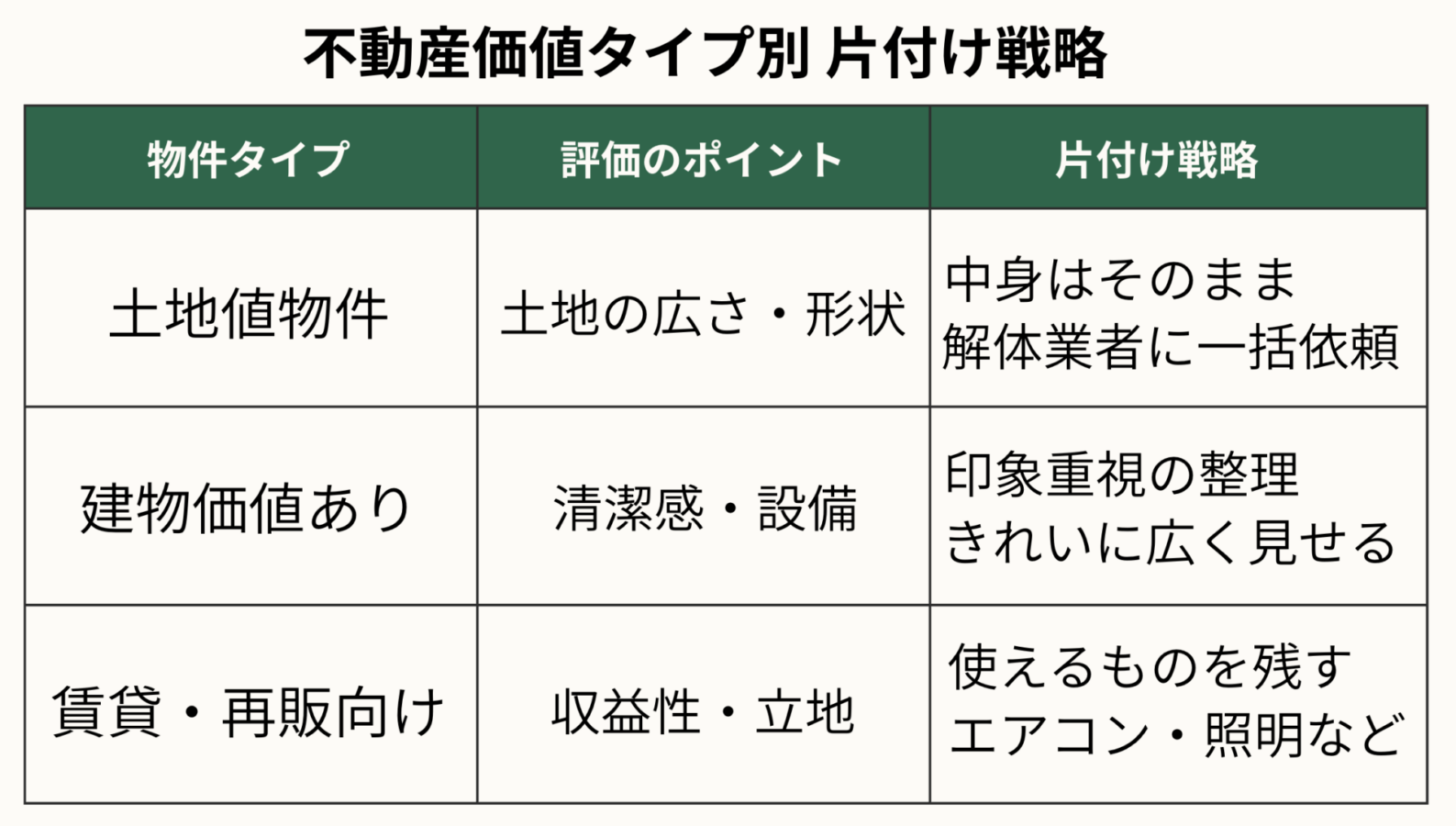 この場合は逆に、解体してしまうと価値を壊すことになります。必要なのは「全部捨てる」ことではなく、「印象を整える片付け」です。
