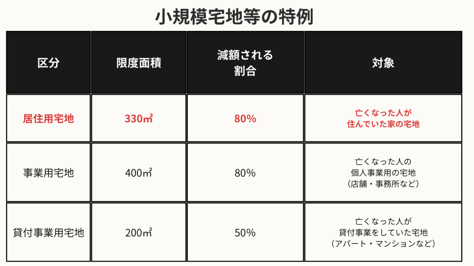 「家なき子特例」とは、相続税の評価額を算出する際に使われる「小規模宅地等の特例」の一つです。小規模宅地等の特例は、一定の条件を満たすことで、相続した実家の土地(居住用宅地:被相続人の自宅用地)の評価額を、330㎡まで80%下げることができるなどの制度です。