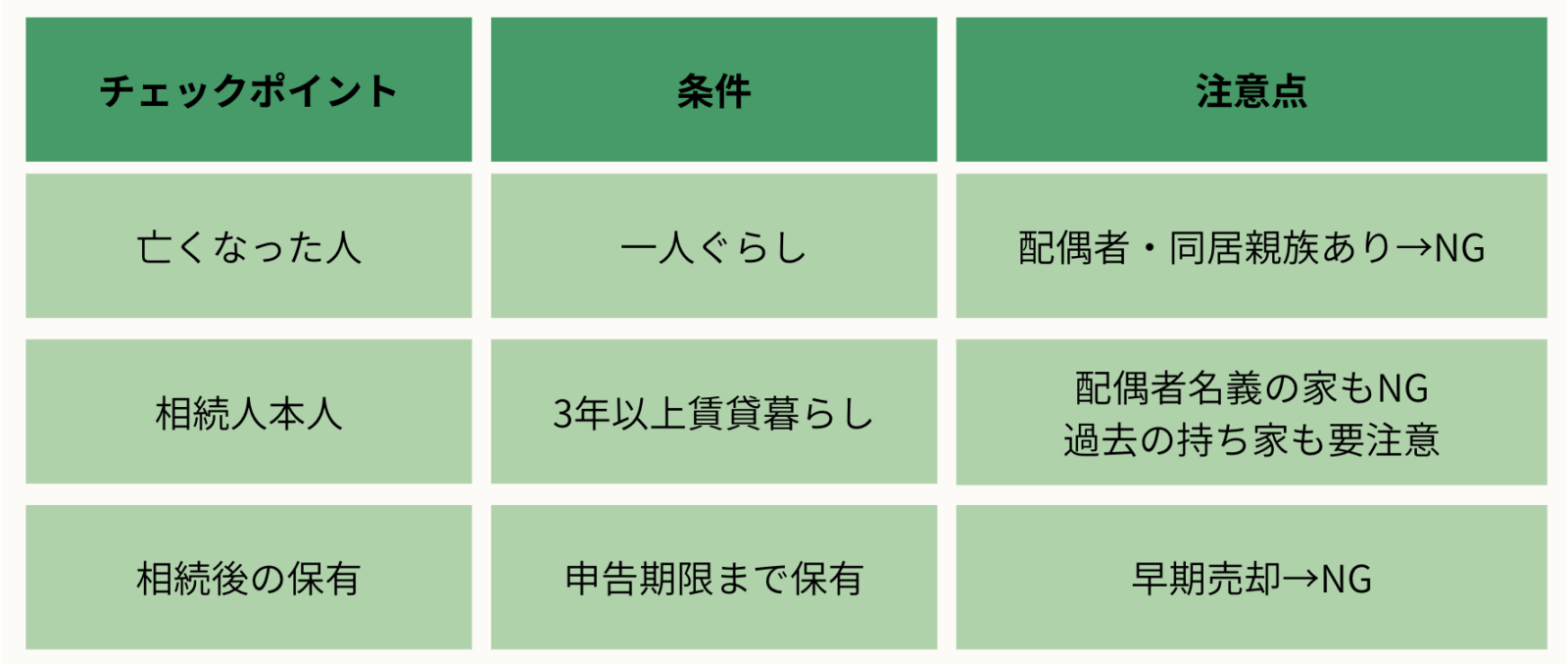 相続開始前の3年間に、自分や配偶者、自分の3親等内の親族、自分が役員を務める会社が所有する住宅に住んでいないことが条件となります。つまり3年以上、「賃貸暮らし」だったことが条件となります。