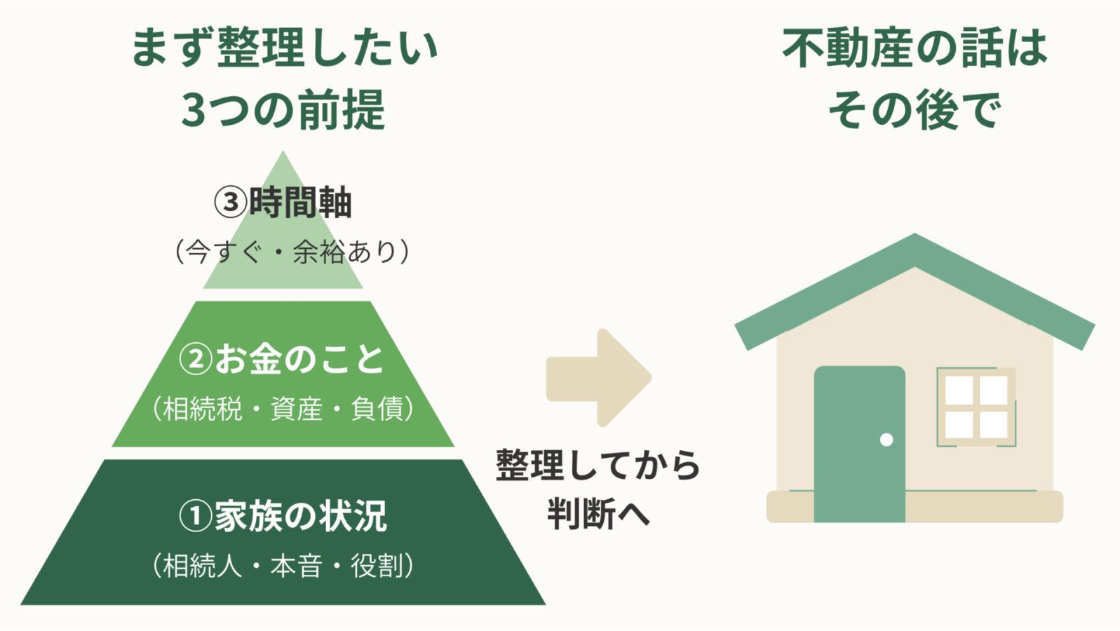 不動産の話を最初にしてしまうと、相談は一見前に進んでいるようで、実は大切な部分が置き去りになります。売るのか、残すのか、貸すのか。選択肢は増えますが、判断の軸が定まらないまま話が広がってしまうのです。